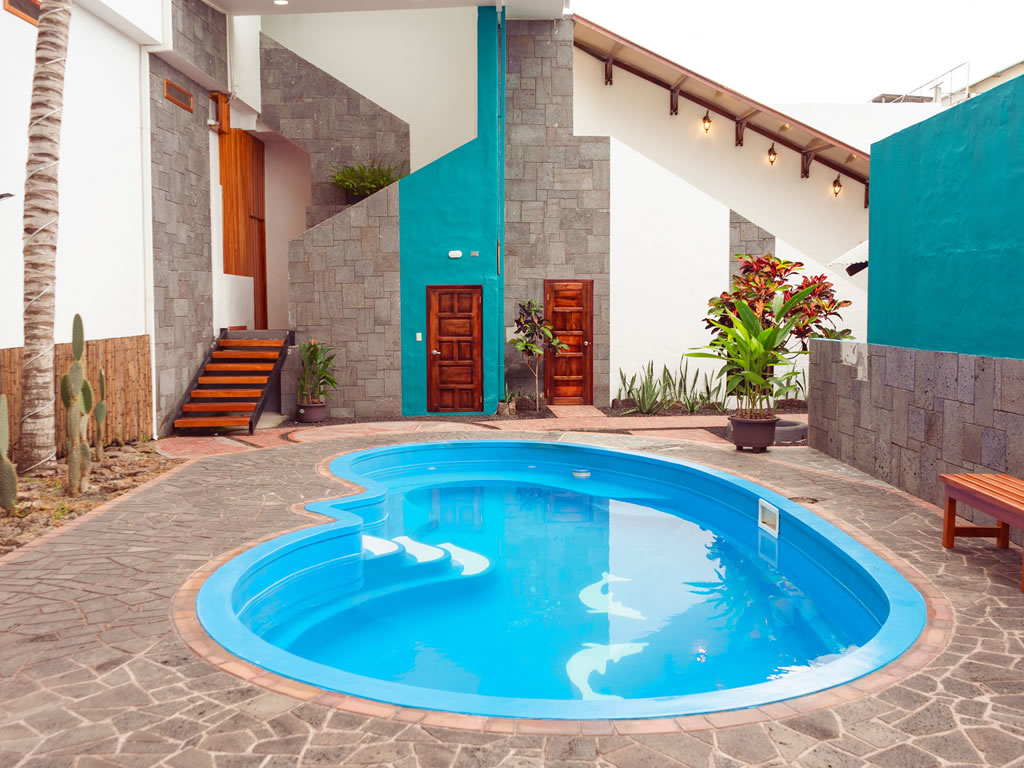Un ambiente tranquilo, limpio y seguro. Areas verde con piscina y comedor, tambien hamacas y un lobby acondicionado. Tenemos un dispensador de agua todo el tiempo. Los hospedajes se encuentran en un segundo y tercer piso, y para acceder necesitan subir escaleras.